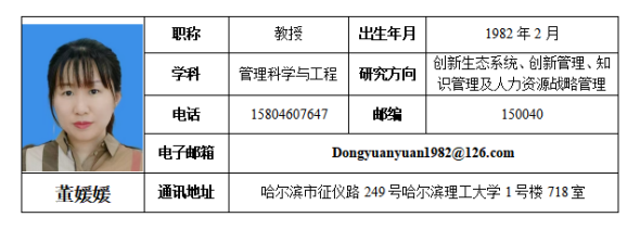 董媛媛,博士,博士后,教授,博士生导师,副院长。研究方向:创新生态系统、创新管理、知识管理及人力资源战略管理。教育部学位论文评审专家,中国技术经济学会技术孵化与创新生态分会理事、黑龙江省管理学学会理事、黑龙江省管理科学与工程学会理事、黑龙江省促进非公经济发展学会常务理事。已主持国家社科基金、教育部人文社科基金项目、黑龙江省自然科学基金、黑龙江省哲学人文社科项目等项目10余项。以第一完成人获省部级科研奖励3项。以第一完成人获得厅局级奖励3项。在SSCI、SCI等国内外重要期刊发表学术论文30余篇。