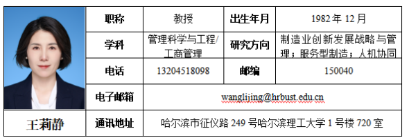王莉静,博士,教授,博士生导师,研究方向:制造业创新发展战略与管理、服务型制造、人机协同。黑龙江省科技经济顾问委员会专家,黑龙江省“马工程”重大课题首席专家,黑龙江省管理科学与工程学会副理事长兼常务副秘书长,中国企业管理研究会新兴技术未来分析与管理专业委员会常务理事,中国技术经济学会技术孵化与创新生态生态分会常务理事,中国技术经济学会技术管理专委会理事,黑龙江省管理学会常务理事,黑龙江省重点培育智库“黑龙江省人口经济与人才发展战略研究中心”入库专家,黑龙江省科技创新与产业发展研究基地副主任,黑龙江省促进非公经济发展学会副会长,《科技管理学报》编辑部主任。主持国家自然科学基金、国家社会科学基金、教育部人文社科基金、黑龙江省自然科学基金、中国博士后科学基金、黑龙江省博士后科学基金等近20项课题。获得省部级科研奖励4项,在国内外重要期刊及国际会议上发表学术论文30余篇,出版学术专著2部。取得的研究成果多次被黑龙江省工信厅、黑河市政府等采用,效果显著。
