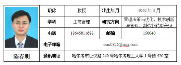 陈春明,博士,教授,硕士生导师,研究方向:管理决策与优化,技术创新与管理,制造业转型升级。黑龙江省管理科学与工程学会理事,在组织创新、制造业转型升级等方面进行了比较深入的研究,出版学术专著1部,已主持完成黑龙江省自然科学基金3项、黑龙江省科技攻关1项、黑龙江省社科基金4项、哈尔滨市科技攻关1项,在国内外重要期刊及国际会议上发表学术论文40余篇,其中2篇分别被《新华文摘》论点摘编和《光明日报(理论版)》部分转载;获得黑龙江省社会科学优秀成果奖著作类二等奖1项和论文类三等奖3项、黑龙江省科技进步三等奖1项。