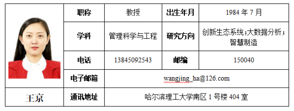 王京,博士/博士后,教授,博士生导师,研究方向:创新生态系统、大数据分析、智慧制造。黑龙江省管理科学与工程学会常务理事,黑龙江省促进非公经济发展学会常务理事,中国技术经济学会技术孵化与创新生态分会理事,黑龙江省管理学学会理事,黑龙江省知识产权研究会理事,国家自然科学基金同行评议专家,国家社科基金项目成果通讯鉴定专家,教育部学位论文评审专家,博士后国资计划评审专家。主持国家社科基金项目1项、国家自然科学基金项目1项(结题优秀)、教育部人文社科基金项目2项、山东省重点研发计划(软科学)项目(重大项目)1项、黑龙江省自然科学基金项目1项、黑龙江省哲学社会科学基金项目2项等10余项科学研究项目及黑龙江省教学改革项目2项等教学研究项目,并参与多项国家级基金项目、省部级科研及教学项目;出版学术专著2部,教材1部,作为第一获奖人获得黑龙江省社会科学优秀成果二等奖1项、黑龙江省高校人文社科二等奖1项、黑龙江省社会科学学科优秀科研成果奖三等奖1项;在国内外重要期刊及国际会议上发表学术论文30余篇。