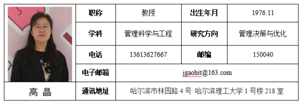 高晶,博士/博士后,哈尔滨理工大学经济与管理学院,教授/博导,中国教育发展战略学会人才发展专业委员会评审专家,中国智慧工程研究会智能学习专家库入库专家,黑龙江省国资委投资咨询专家,黑龙江省管理科学与工程学会理事,黑龙江省管理学学会理事,黑龙江省东北亚经济技术研究会理事。主要研究方向:管理决策与优化、战略决策与管理、知识管理与协同创新、创新生态系统等。主持国家自然科学基金1项、国家社科基金项目1项、黑龙江省应用技术研究与开发计划项目1项、黑龙江省社会科学基金1项、黑龙江省经济社会发展重点研究课题1项、中国博士后基金1项、黑龙江省博士后资金项目2项;参与国家自然科学基金项目2项,省级科研项目10余项。获黑龙江省社会科学优秀成果二等奖1项、三等奖1项、优秀奖1项。在Journal of Innovation & Knowledge、International Journal of Information Management、Journal of Business Research等SSCI期刊,SCI期刊和CSSCI期刊发表相关论文30余篇。出版教材5部,第三批黑龙江省线上线下混合式一流课程负责人,校级第四批课程思政示范课项目负责人。指导本科生参加省“挑战杯”、“互联网+”、“商业模式创新大赛”等比赛,荣获省级、校级优秀指导教师称号。