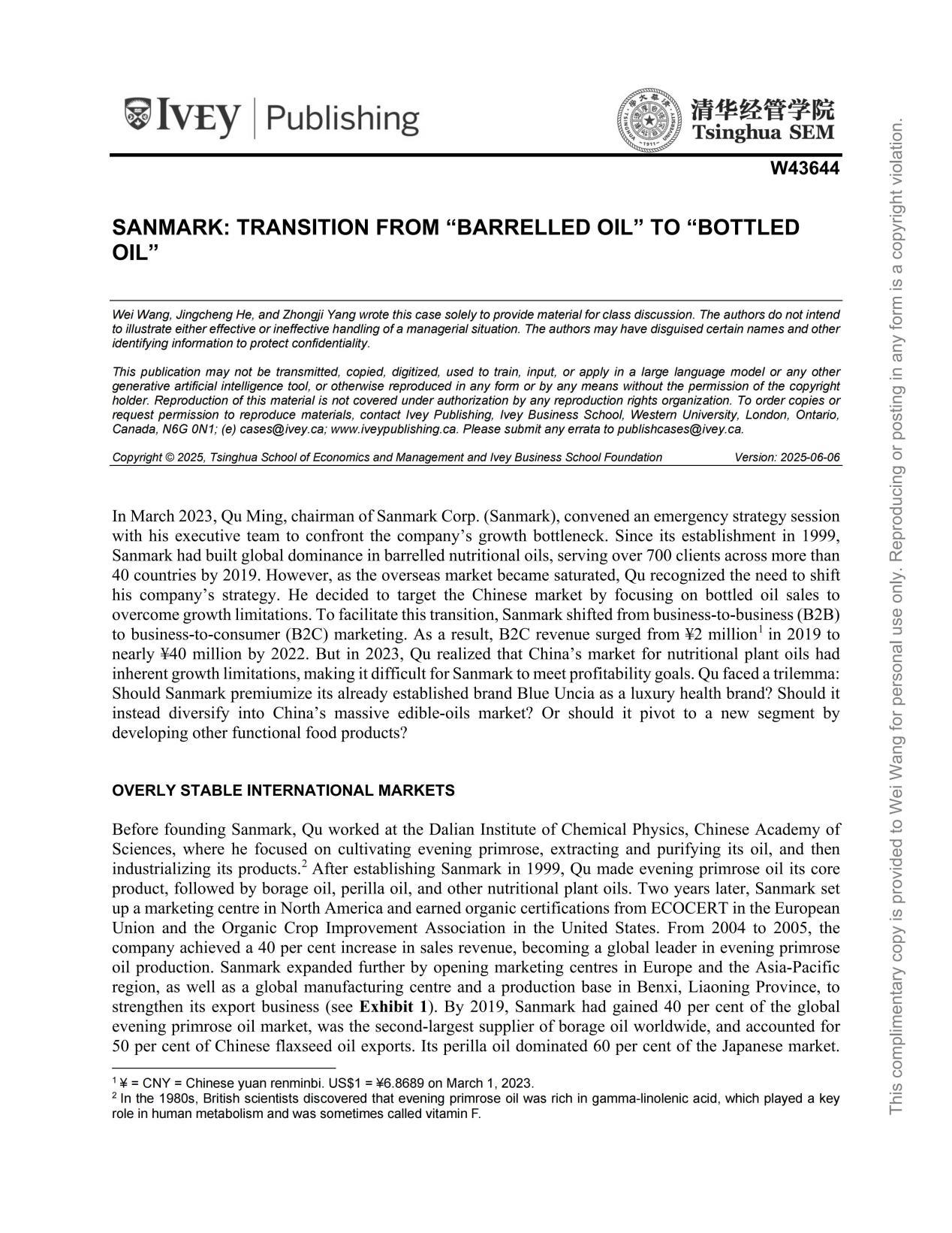近日,我院王卫教授为第一作者撰写的案例《Sanmark: Transition from "Barreled Oil" to "Bottled Oil"》被国际顶尖商学案例库——加拿大毅伟商学院案例库(Ivey Publishing)收录入库并在全球出版发行,案例编号:W43644。案例描述了晟麦实业(Sanmark)为适应从海外B端市场转向国内C端市场的逻辑差异而实施的一系列转型举措,并旨在分析讨论这一转变的决策过程及过程中可能面临的机遇与挑战。案例合作者为清华大学案例研究员贺竞成、哈尔滨理工大学杨仲基副教授。这是我院教师首篇被海外知名案例库收录的教学案例,标志着我院在国际教学案例开发和建设工作方面取得了新突破!